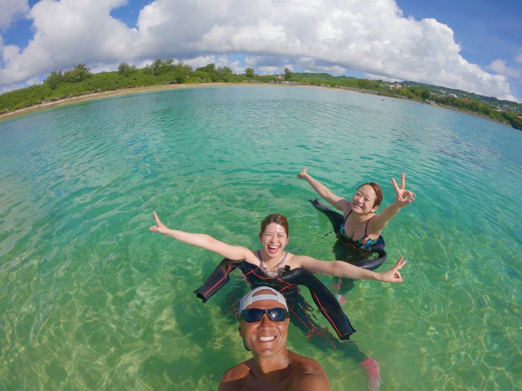 バディで助け合ってフィンを履きます。